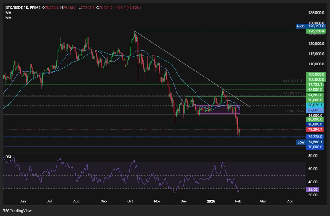 Bitcoin has rebounded from yesterday’s 74.5k low, trading over 4% higher at around 78k at the time of writing. The recovery comes as risk sentiment improves following a rebound in precious metals and stronger-than-expected earnings from AI-focused firms. Accumulation by Strategy alongside renewed ETF inflows has also helped lift prices.
