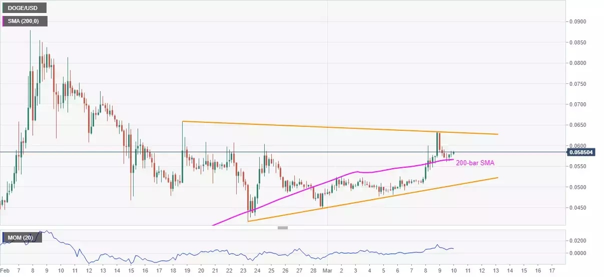 Dogecoin keeps the previous day’s bounce off 200-bar SMA while rising to $0.0584, up 0.72% intraday, during early Wednesday. Considering the upbeat MOM signals, DOGE/USD is eyeing the resistance line of a symmetrical triangle established since February 18, currently around $0.0630.