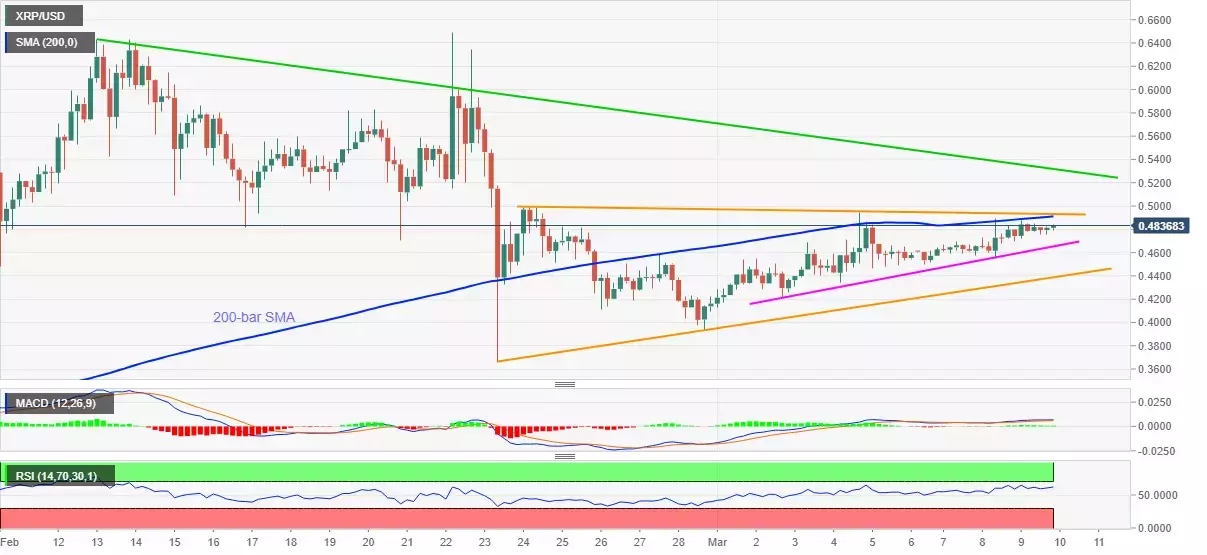 Ripple buyers shouldn’t too optimistic as multiple hurdles are up for offering a bumpy road despite the latest four-day winning streak. That said, XRP/USD stays firm at around $0.4850 during early Wednesday. A resistance line from February 13 adds to the upside filters.