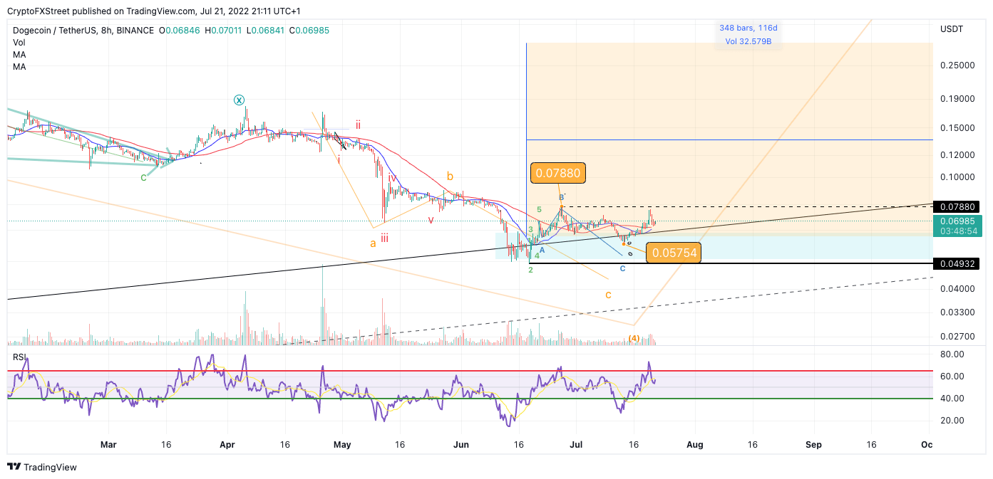 Dogecoin price hovers above two compressing moving averages. DOGE price shows support on the Relative Strength Index after performing a break of structure rally. Invalidation of the uptrend is a breach below the swing low at $0.049.