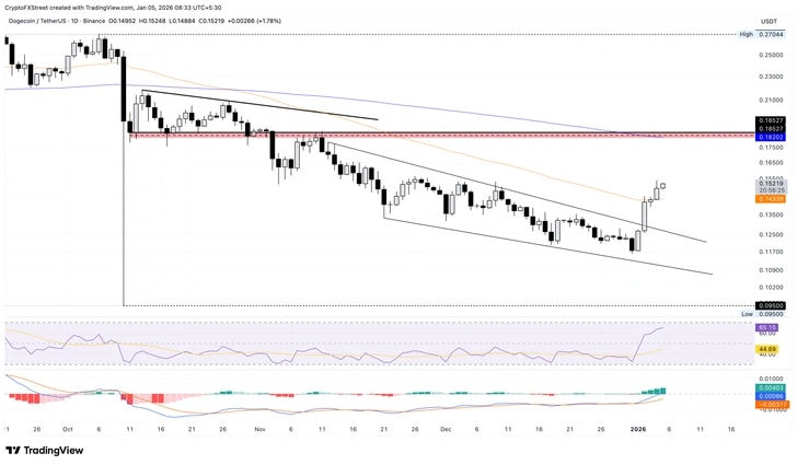 Dogecoin is up 2% at press time on Monday, building on the 4% gains from Sunday. The dog-themed meme coin extends its recovery over the 50-day Exponential Moving Average (EMA) at $0.14339 and trades above the $0.15000 round figure. Dogecoin’s recovery reflects the breakout rally of a descending wedge pattern on the daily logarithmic chart. The breakout rally aims for the 200-day EMA at $0.18202, aligning with the overhead supply zone between $0.18100 and $0.18500.