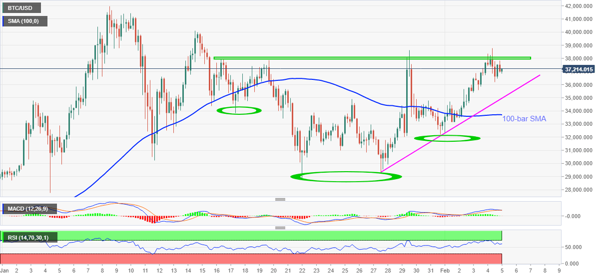 BTC/USD eases to $37,100 during early Friday. Even so, the crypto major portrays a bullish chart formation on the four-hour (4H) play and is well keeping the uptrend, as per the MACD and RSI conditions. The latest pullback could be traced from the downbeat comments from the Reserve Bank of Australia (RBA) official.
