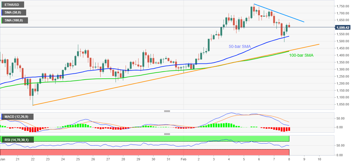 ETH/USD eases from intraday top of $1,633 to $1,604 during early Monday. Even so, the altcoin keeps its bounce off 50-bar SMA as the Chicago Mercantile Exchange (CME) launches Ether Futures. Receding bearish MACD, upbeat RSI favor bulls eyeing short-term resistance line.