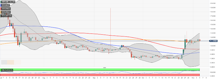 NEO reached the bottom at $10.144 on October 30. The coin had been recovering within the range and broke above critical $11.00 on Monday. It was a hard nut to crack for NEO bulls as it was strengthened by SMA200 (Simple Moving Average) daily.