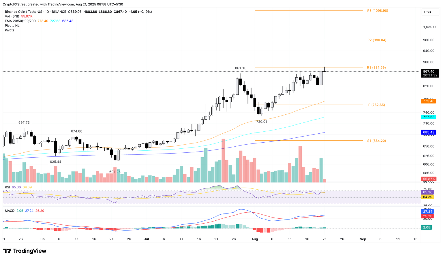 BNB token trades at $867 at press time on Thursday as it retraces from the all-time high of $883 earlier in the day. The residual bullish momentum from the 5.45% rise on Wednesday tests the R1 pivot resistance level at $881.