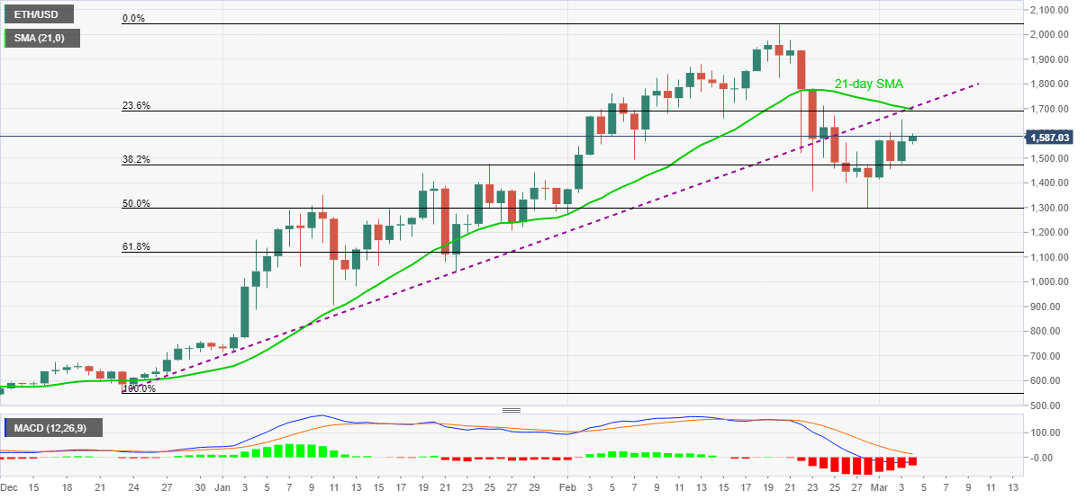 Ethereum bulls are in full swing while attacking the $1,600 level, currently up 1.77% intraday near $1,595, amid initial Thursday. In doing so, the altcoin extends recovery moves from a one-month low, marked on Sunday. Bears will have a bumpy road on their return. The price is establishing on the downside and the focus shifts to the upside. Bulls can target a bullish structure's neckline from the daily chart as follows.
