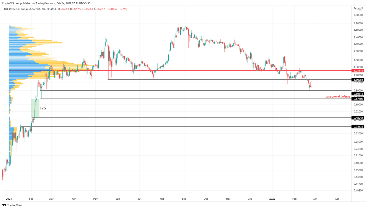 Cardano price shows that it has two stable support levels beyond which, it could crash swiftly to $0.459. A bounce off the current foothold at $0.805 is likely to trigger a 25% ascent to $1. Failing to hold above $0.805 will lead to a 16% crash to the last line of defense at $0.676.