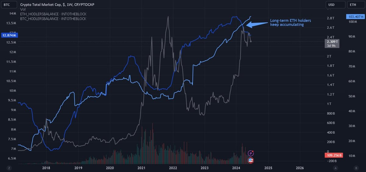 Ethereum’s (ETH) long-term holders have continued scooping up Ether while Bitcoin’s long-term holders shed their holdings. New yield opportunities in Ether, and the upcoming ETF are likely behind the divergence in the behavior of the long-term holders of BTC and ETH.