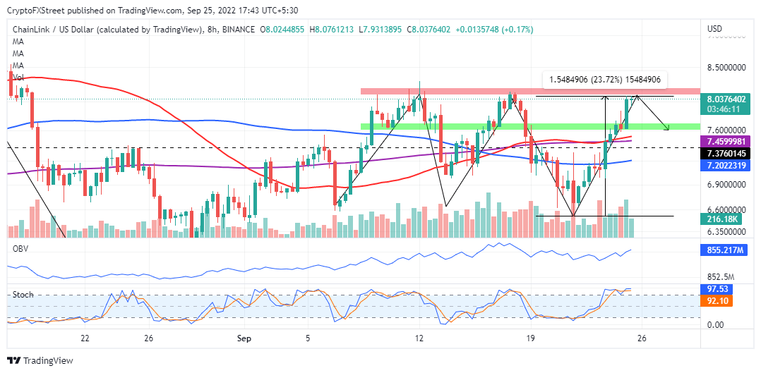 Chainlink price is among the few crypto assets in the green on Sunday. The smart contacts’ price feed oracle token defied the bear market this week to post 23.7% gains. As discussed earlier in the week, the V-shaped pattern matured at LINK brushed shoulders with $8.00.