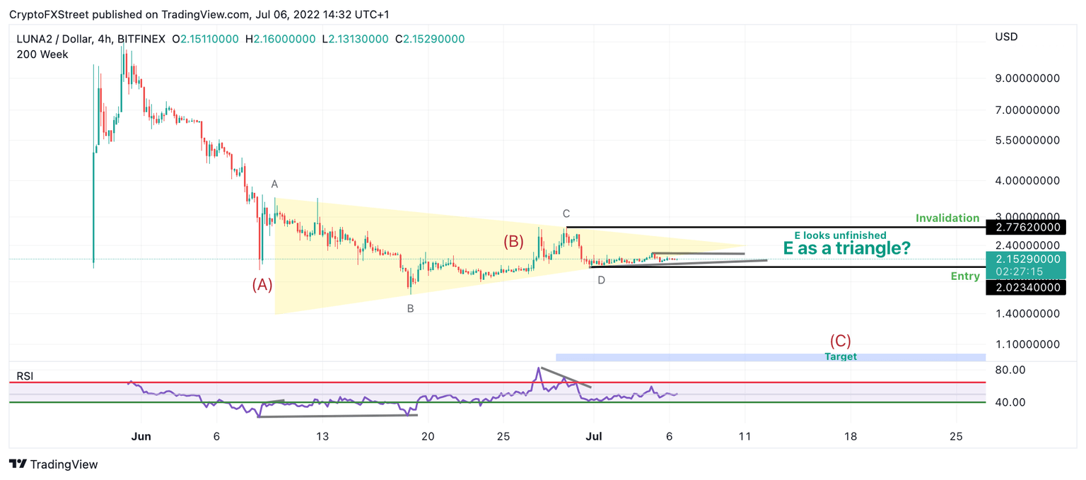 Terra's LUNA price sideways action is finally starting to make sense. Since the cataclysmic sell-off, the range-bound consolidation has produced both diminishing returns and losses between each directional shift. On July 6, 2022, the technicals display a coiling triangle pattern which justifies the lackluster price action investors of the LUNA price have been experiencing.