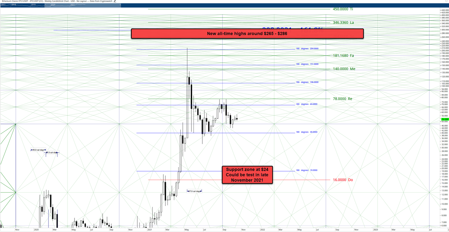 How are future Ethereum Classic price levels determined if they have never traded at those price levels before? A series of different types of analysis should be completed to speculate and project a future price range. For this analysis, I will be utilizing Elliot Wave Theory, natural harmonic values found in the light and sound spectrum – specifically the methods by the great Gann analyst, Tony Plummer (The Law of Vibration, and The Life Cycle Hypothesis), Gann's Square of 9 and Fibonacci expansion zones. The result of this analysis shows a cluster of price ranges, all with the same value area.