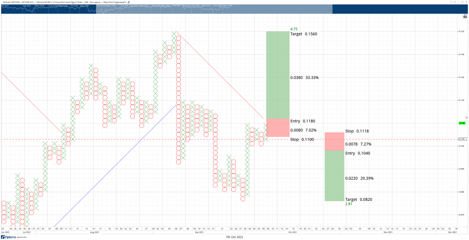 VeChain price has an extremely favorable setup on its $0.002/3-box reversal Point and Figure Chart. The implied target area from a breakout is a 4.75:1 reward to risk ratio, representing one of the best bullish opportunities in the altcoin space.