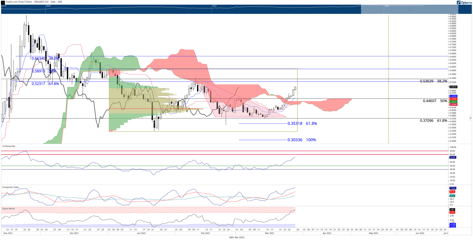 Crypto.com price is approaching the most important psychological price level: the $0.50 level on its daily chart. While $0.50 is an important price level, there is not much in the form of technical resistance at $0.50. The next major resistance zone doesn’t appear until $0.60, so CRO may likely continue to move higher without much pressure.