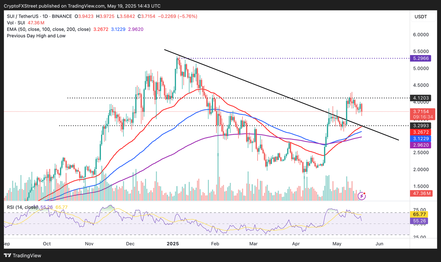Sui's (SUI) price faces headwinds around $3.71 on Monday, following a slightly bullish Sunday. The layer-1 blockchain token has, since the sentiment-driven rally to $4.30 on May 12, been confined below $4.00 despite consistency in digital asset inflows, which reached $9.3 million last week.