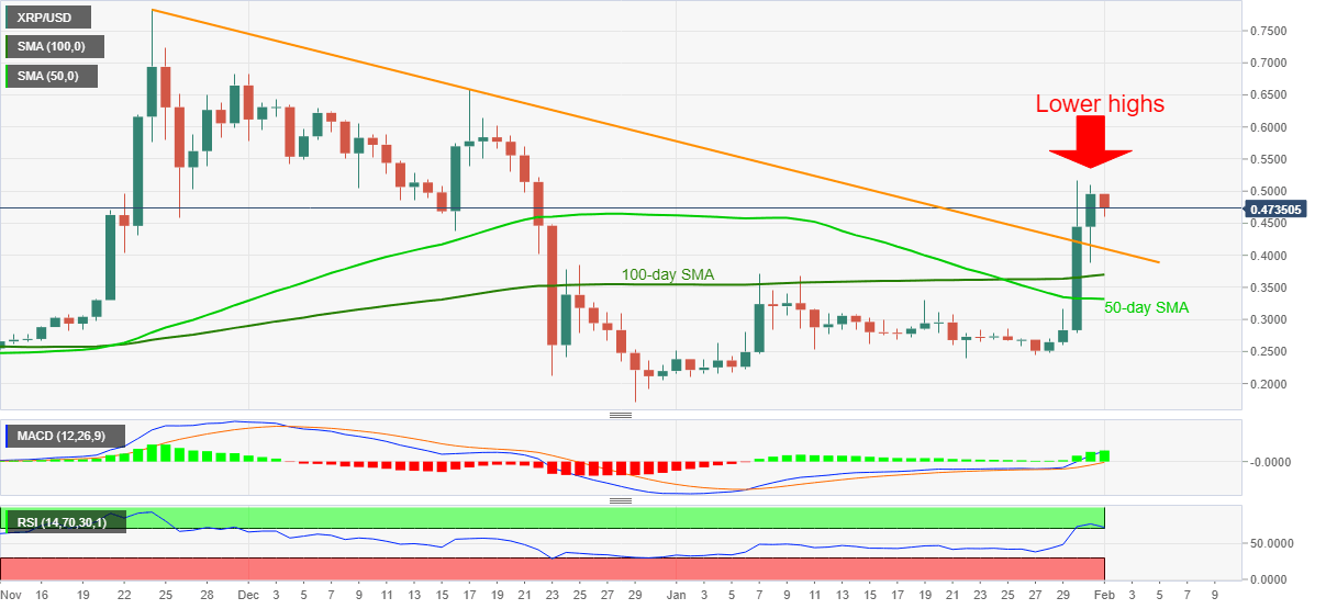 XRP/USD eases from six-week top flashed during the weekend. XRP/USD drops to 0.4605, currently around 0.4705, during the latest downtick during early Monday. In doing so, the altcoin prints the third day of lower high amid overbought RSI conditions.