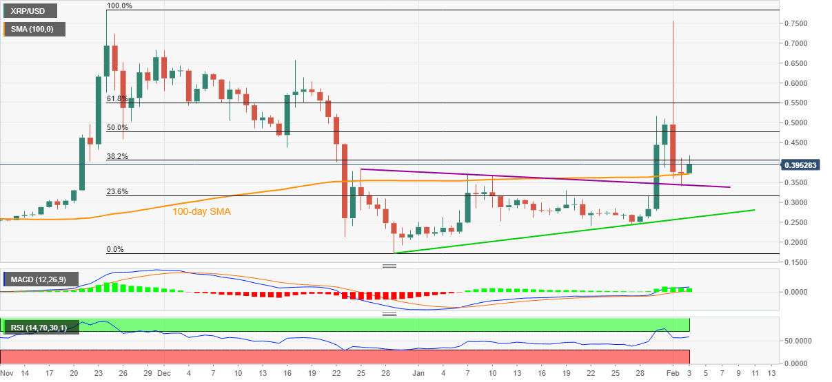 XRP/USD picks up the bids around 0.3965 during early Thursday. The cryptocurrency pair marked a reversal from 100-day SMA and a six-week-old support line, previous resistance, the previous day. Sellers have yearly support line as an extra barrier to cross for entry.