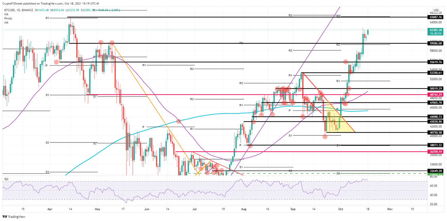 Bitcoin price (BTC) has been on a tear these past few days, with bulls breaking $60,000. To keep the uptrend intact, buyers will want to wait for the daily Relative Strength Index (RSI) to dip back below 70. This dip below 70 in the RSI would coincide with a test of $60,000 and would offer new buyers a good entry for the next phase in the uptrend toward $65,087 or new all-time highs.
