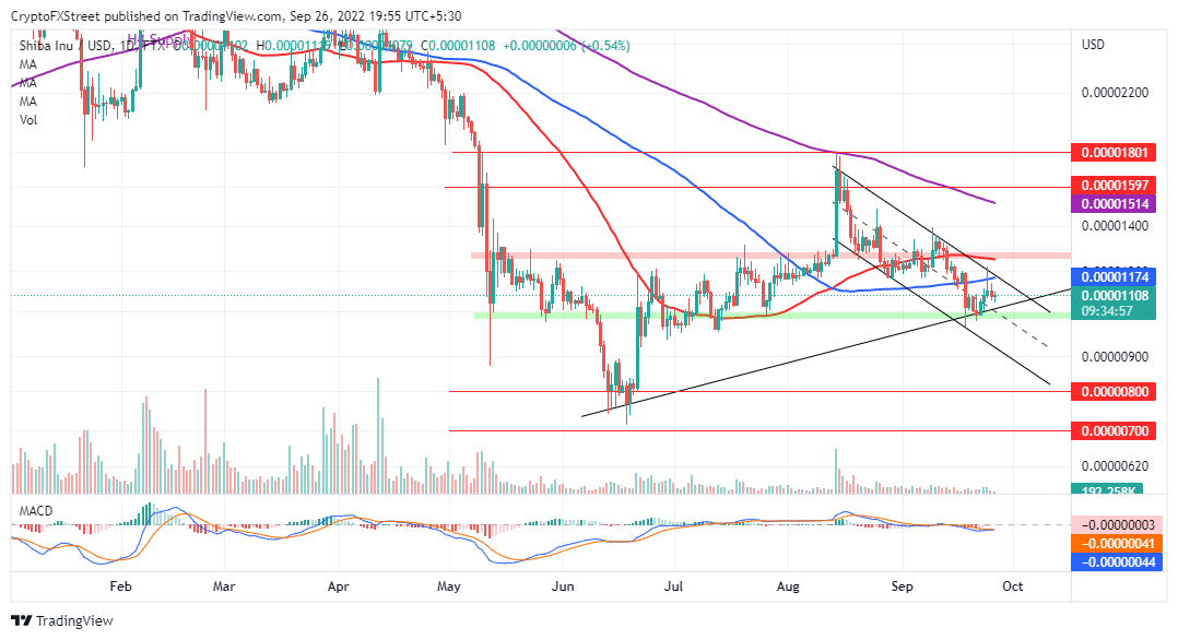 Shiba Inu price is moving sideways around $0.00001100 after getting rejected at $0.00001225. The second-largest meme coin has been in a down trending channel since it encountered an intensive seller congestion area at $0.00001801 in early August. Interestingly, SHIB’s declines respected a rising trend line alongside its primary support, encouraging investors to take up long positions.