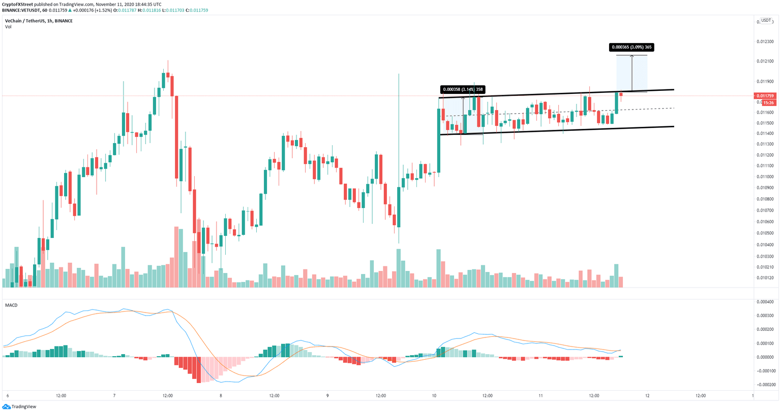 Vechain had a massive 14% price pump on November 9 hitting a high of $0.0118 and establishing an ascending parallel channel shortly after. The most critical resistance level is the upper boundary of this pattern.