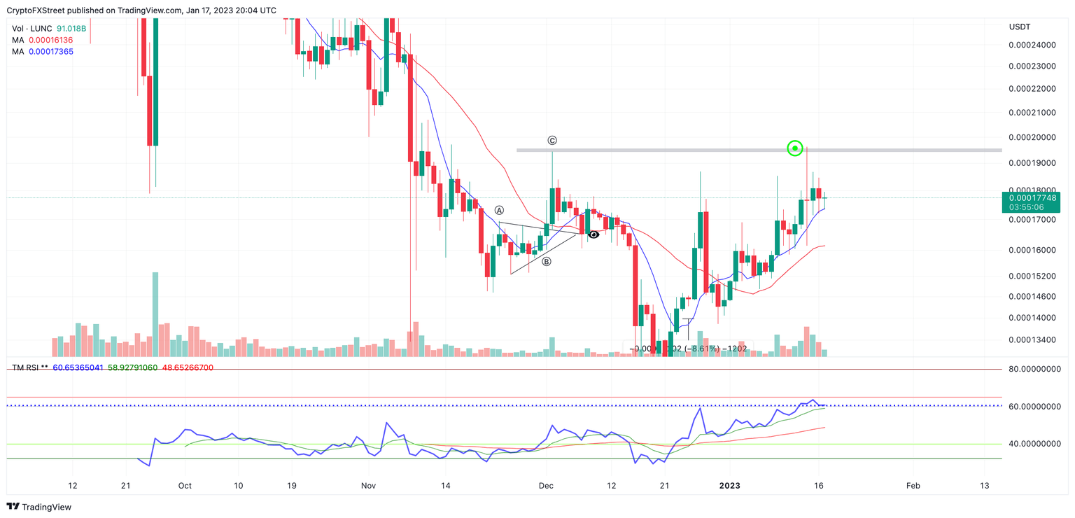 Terra's Luna Classic price confirms the bullish trade idea mentioned in the previous outlook. Traders should be wary of the profit-taking consolidation as a deeper pullback could occur. Terra's Luna Classic price broke up by 17% to the upside last week, tagging the liquidity above December's high at $0.00019437.