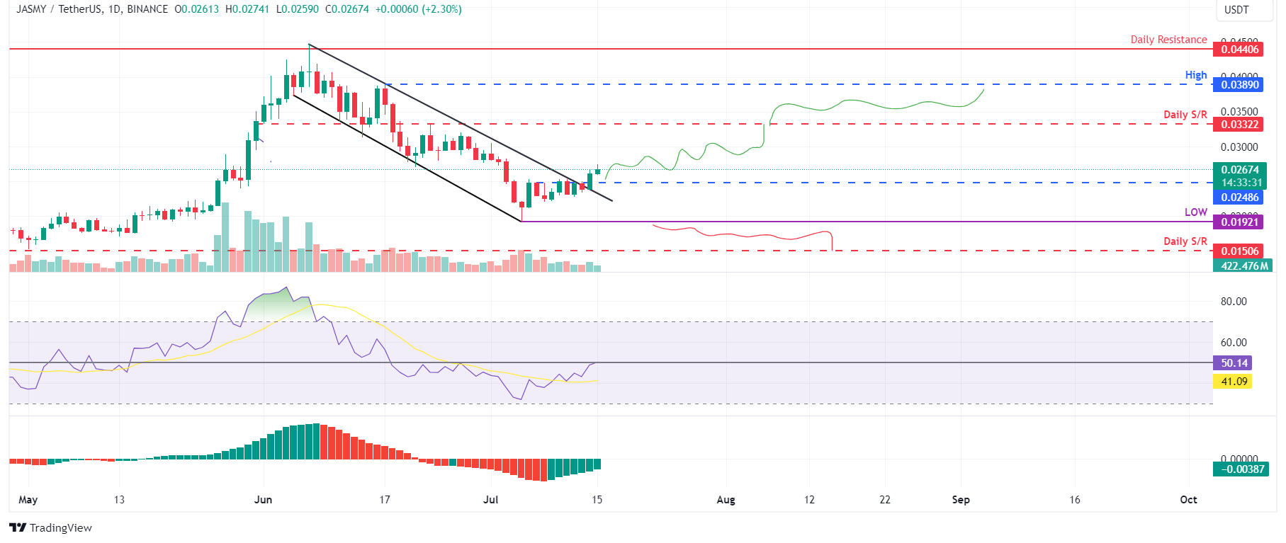 JasmyCoin (JASMY) broke above the descending channel on Sunday, extending its upward movement by 2.3% at the time of writing on Monday. The announcement of a partnership with NOWPayments, a cryptocurrency payment gateway company, coupled with a feature in a Forbes article, bodes well for JASMY, potentially setting the stage for a price rally in the days ahead.