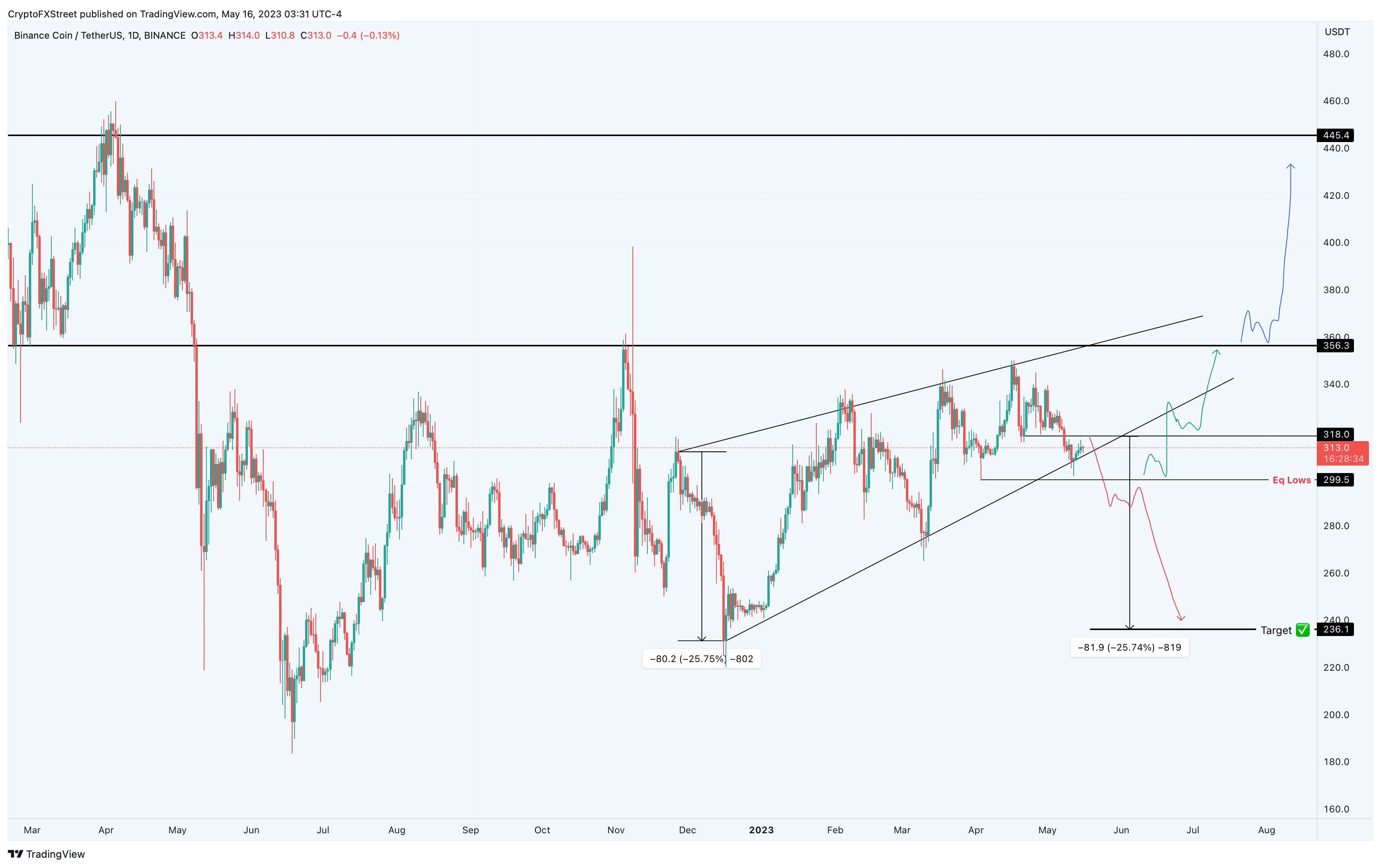 Binance Coin price has been consolidating in a rising wedge pattern since November 2022. This technical formation contains four higher highs and three lower lows formed between November 2022 and May 2023. Connecting these swing points using trend lines reveals a rising wedge setup.