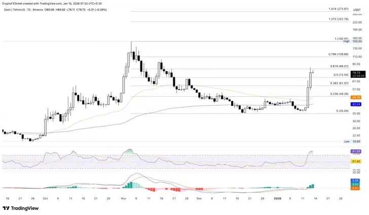 Dash trades near $80 at press time on Thursday, holding 35% gains from Wednesday, which amount to roughly 120% gains so far this week. The privacy coin faces opposition from the 61.8% Fibonacci retracement level at $86, traced between the November 4 high at $150 and the December 19 low at $35 on the daily logarithmic chart. If DASH clears this level, it could target the $100 psychological mark, followed by the 78.6% Fibonacci retracement level at $109.