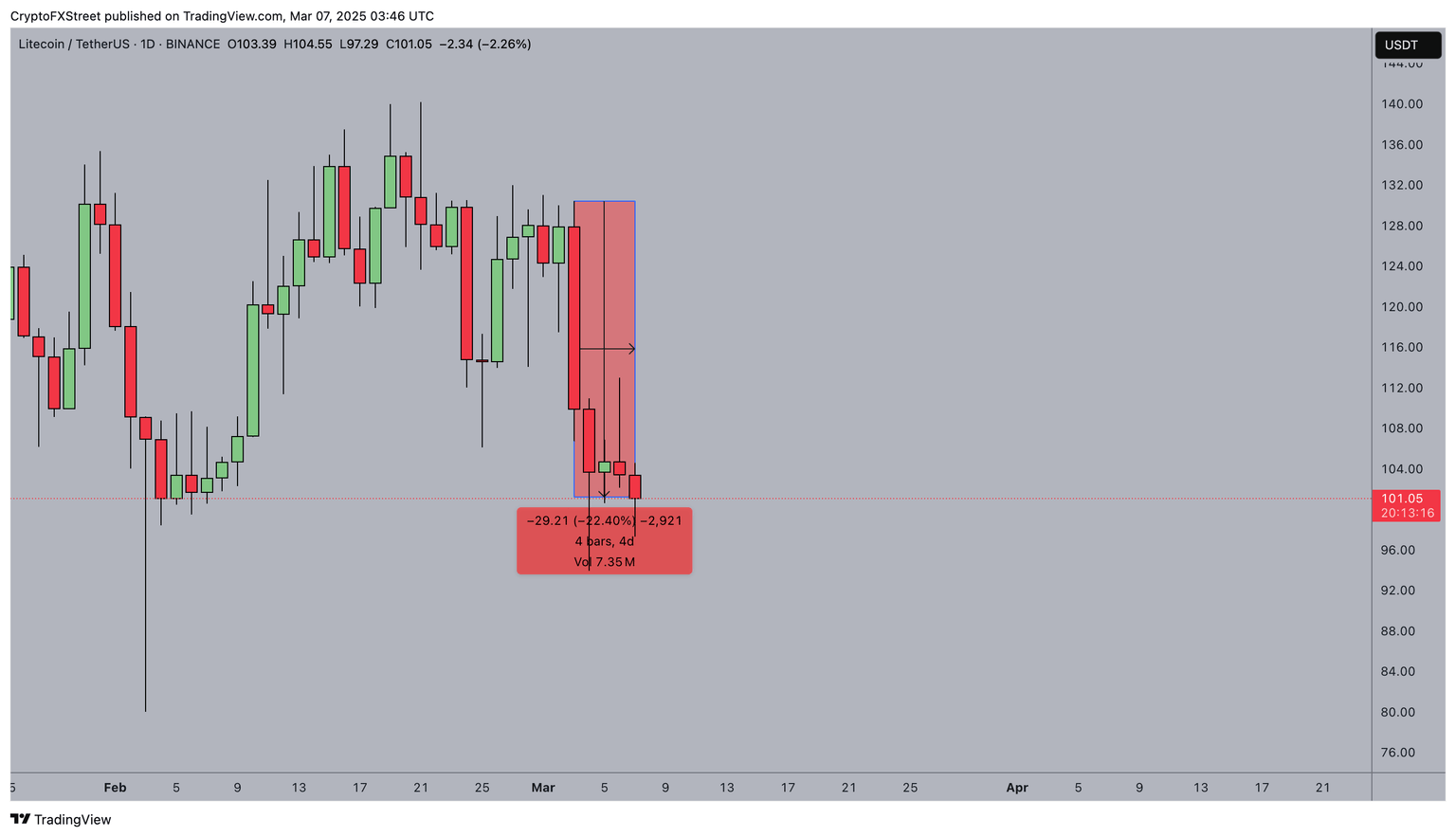 Litecoin price dipped below the $100 mark on Thursday, losing 22% in the past week as markets reacted to updates to US trade tariffs and speculation surrounding White House Crypto Summit to be held on Friday. With LTC traders mounting additional short leverage positions, LTC faces further downside risks.