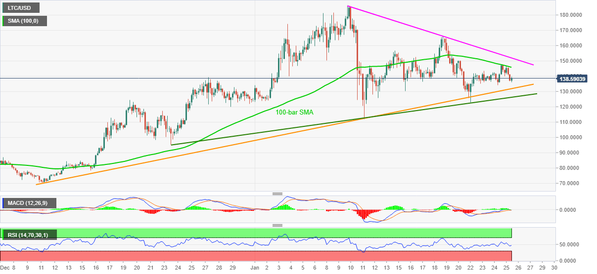 LTC/USD fades the day-start bounce off 136.15 while stepping back from 139.75, currently around 137.53, during early Tuesday. The altcoin took a U-turn from 100-bar SMA while portraying its weakness the previous day. Also on the negative side could be the MACD histogram that flirts with the LTC/USD bears.