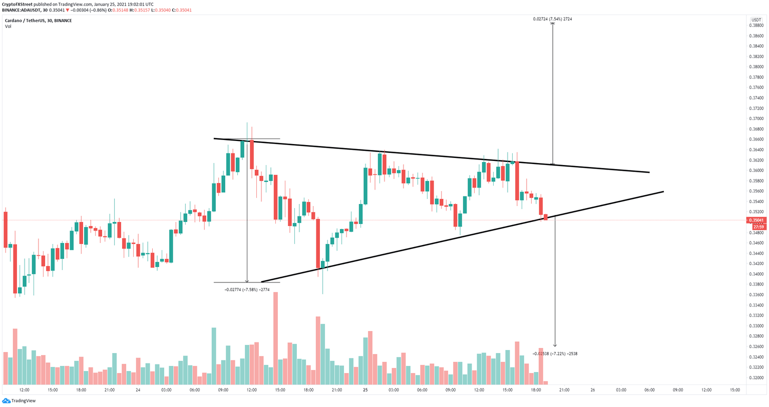 Cardano has been trading inside a tightening range on the 30-minutes chart and seems to be on the verge of a potential breakdown. The most crucial support level is located at $0.35 and it’s the key for the bears to a 8% fall. On the 30-minutes chart, Cardano has established a symmetrical triangle pattern which is really close to a breakdown.