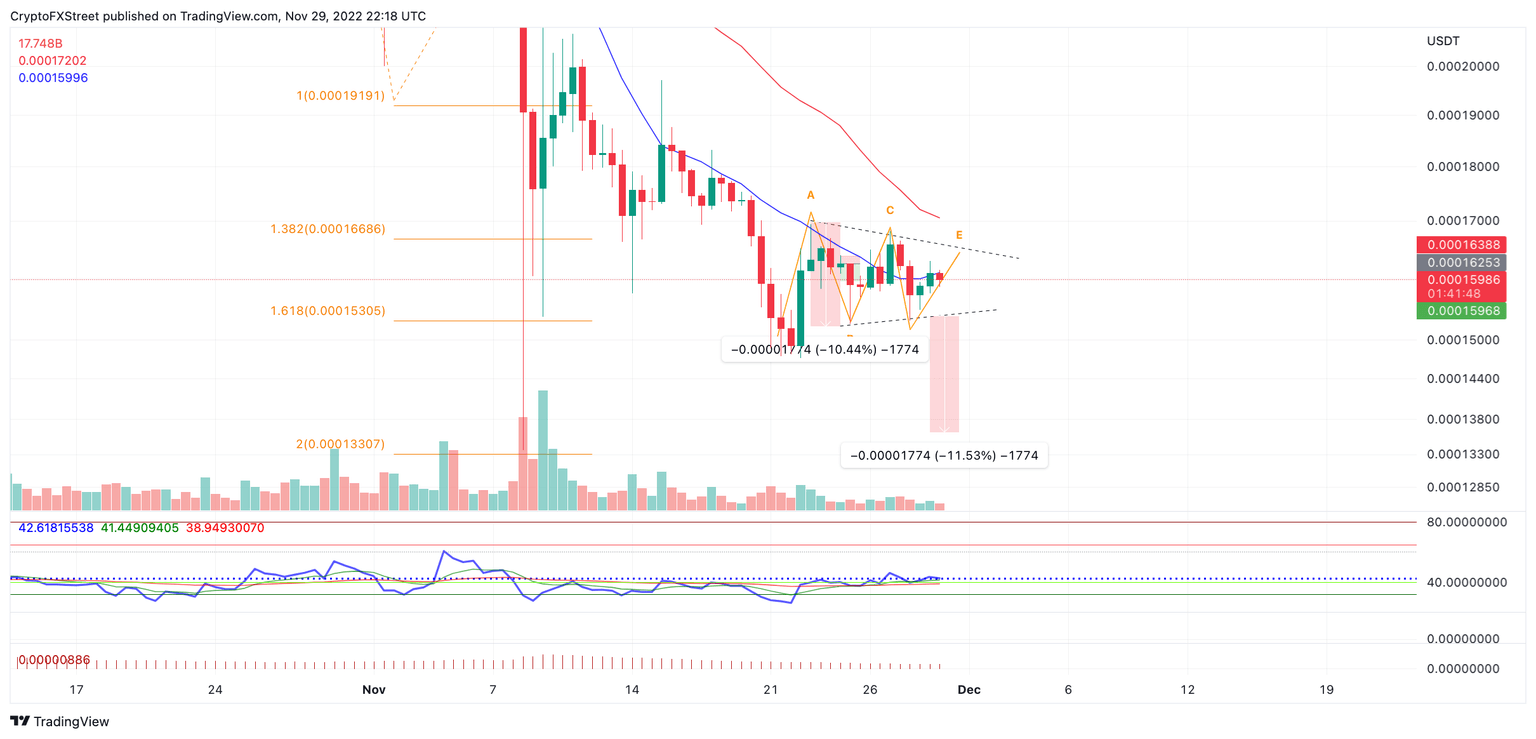 Terra's Luna Classic price has been trading range bound for over a week. The consolidating range has produced higher highs and higher lows following each change of trend. If the technicals are correct, LUNC could be setting up for one more 10% decline before a market reversal occurs.