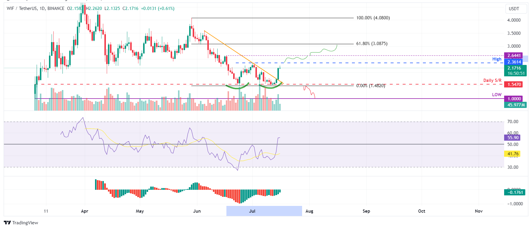 Dogwifhat (WIF) price broke above a descending trendline on Monday, suggesting a potential bullish move. At the time of writing, it is slightly up 1% at $2.171 on Tuesday. Additionally, WIF's price action reveals the formation of a double bottom pattern, signaling a possible trend reversal on the horizon.