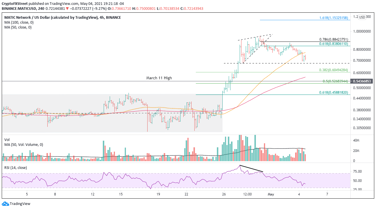 MATIC price decline since the April 29 high at $0.946 has taken a corrective form, and it is near completion, touching the trough of the rising wedge pattern at $0.675. Volume profile does not reveal an eager desire to liquidate or cut holdings.