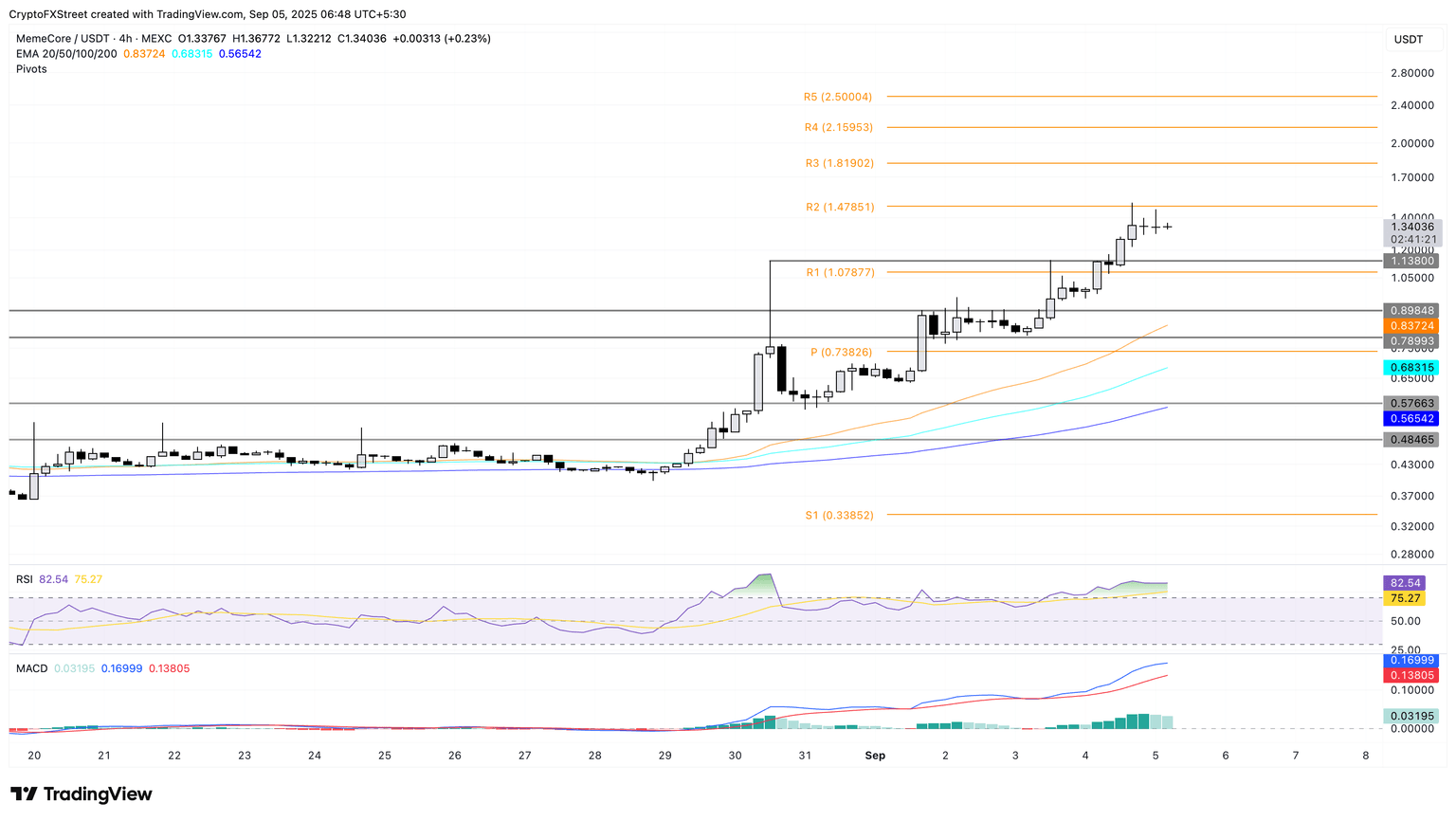 MemeCore edges higher by 1% at press time on Friday, building on the 34% jump from the previous day. The uptrend in the meme coin has expanded for eight days, after reaching a record high of $1.50 on Thursday. The bullish run faces opposition at the $1.47 level, aligning with the R2 pivot level on the 4-hour chart. A decisive close above this level could stretch the uptrend to $1.81, aligning with the R3 pivot level.
