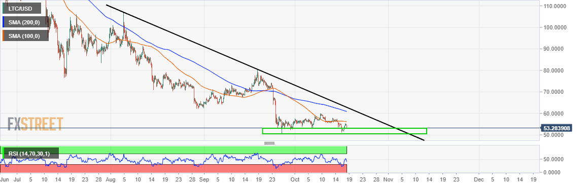 Litecoin resumed the downtrend after testing $55 on Thursday. The bears are extending the leg towards $50. However, LTC/USD is holding ground above $53.