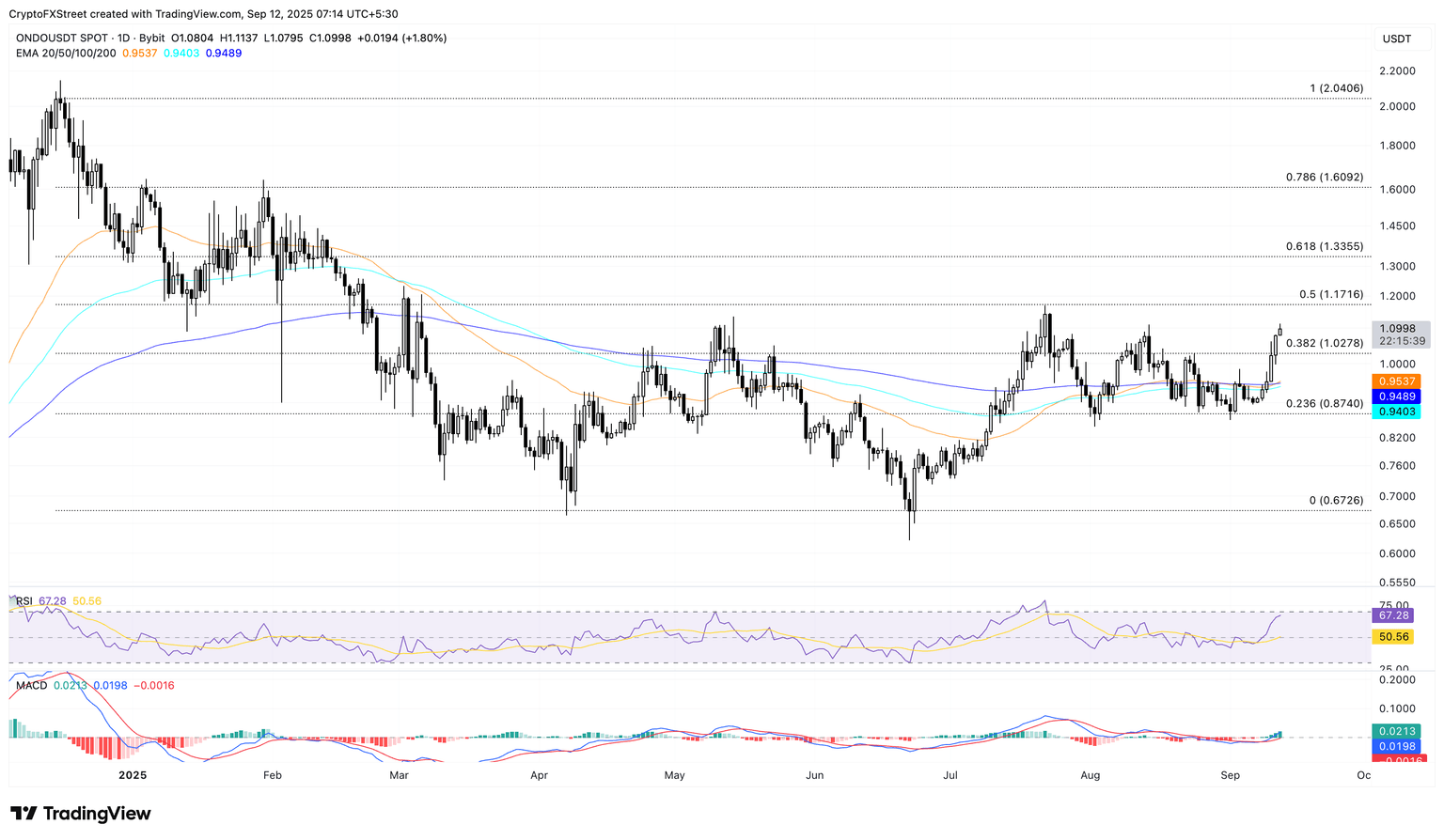 Ondo holds a steady rise above the $1.00 psychological level, extending the gains for the sixth consecutive day. At the time of writing, ONDO appreciates nearly 2% on Friday, targeting the 50% retracement level at $1.17, which is retraced between the December 15 close at $2.04 to the June 22 close at $0.62. A clean push above this level could extend the rally to the 61.8% Fibonacci retracement level at $1.33.