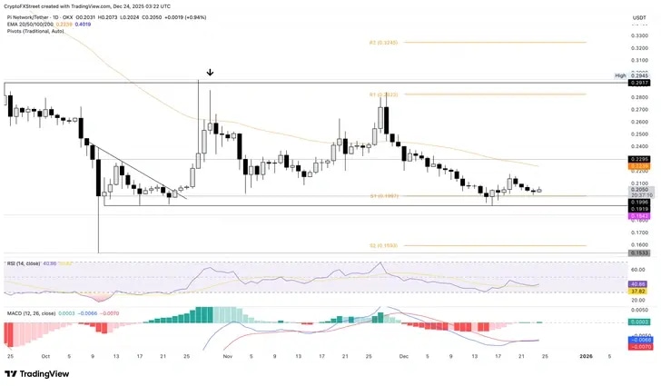 Pi Network (PI) edges higher by almost 1% at press time on Wednesday, bouncing off the $0.2000 level after a four-day decline. The recovery lacks momentum as the social interest surrounding Pi Network declines. Technically, PI is at a crossroads, struggling for a rebound as momentum is lacking. Santiment data shows that the social interest in Pi Network is declining, signaling reduced retail demand. It also shows that the social dominance and volume for PI are down to 0.013% and 6, respectively, on Wednesday, from the 0.017% and 24 peak on December 6.