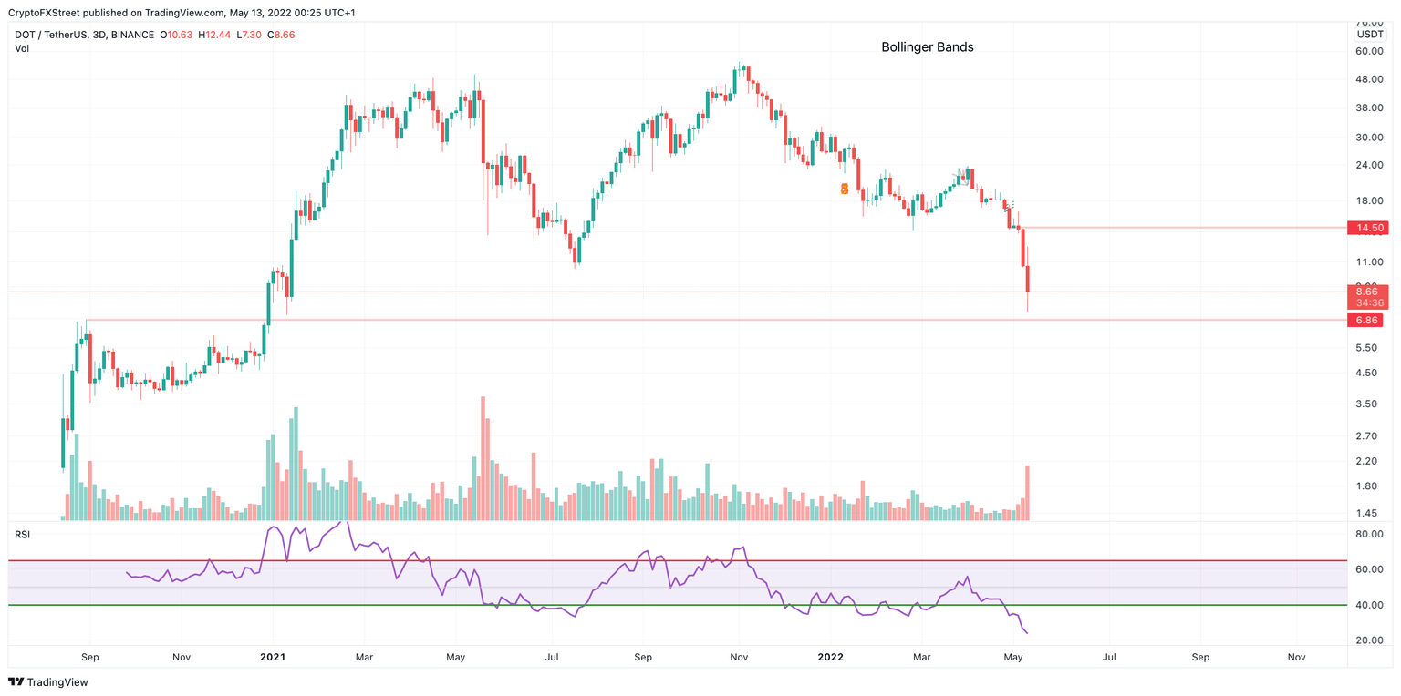 Polkadot price could continue the steep decline, and a short opportunity could present itself, but the technicals need more time to establish a clear entry. Polkadot price, like most cryptocurrencies in the space, is under considerable bearish pressure. Today, the bears are moments away from printing a bearish engulfing candlestick on the 3-day chart.