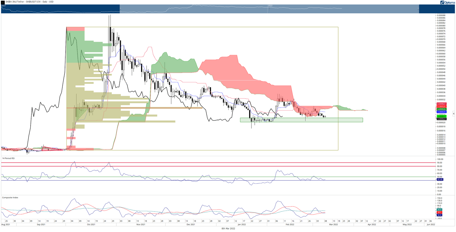 Shiba Inu price continues to trade lower but has stabilized relative to the rest of the cryptocurrency market. While the Ichimoku chart shows extremely bearish trading conditions, sellers have been unable or unwilling to capitalize on that weakness.