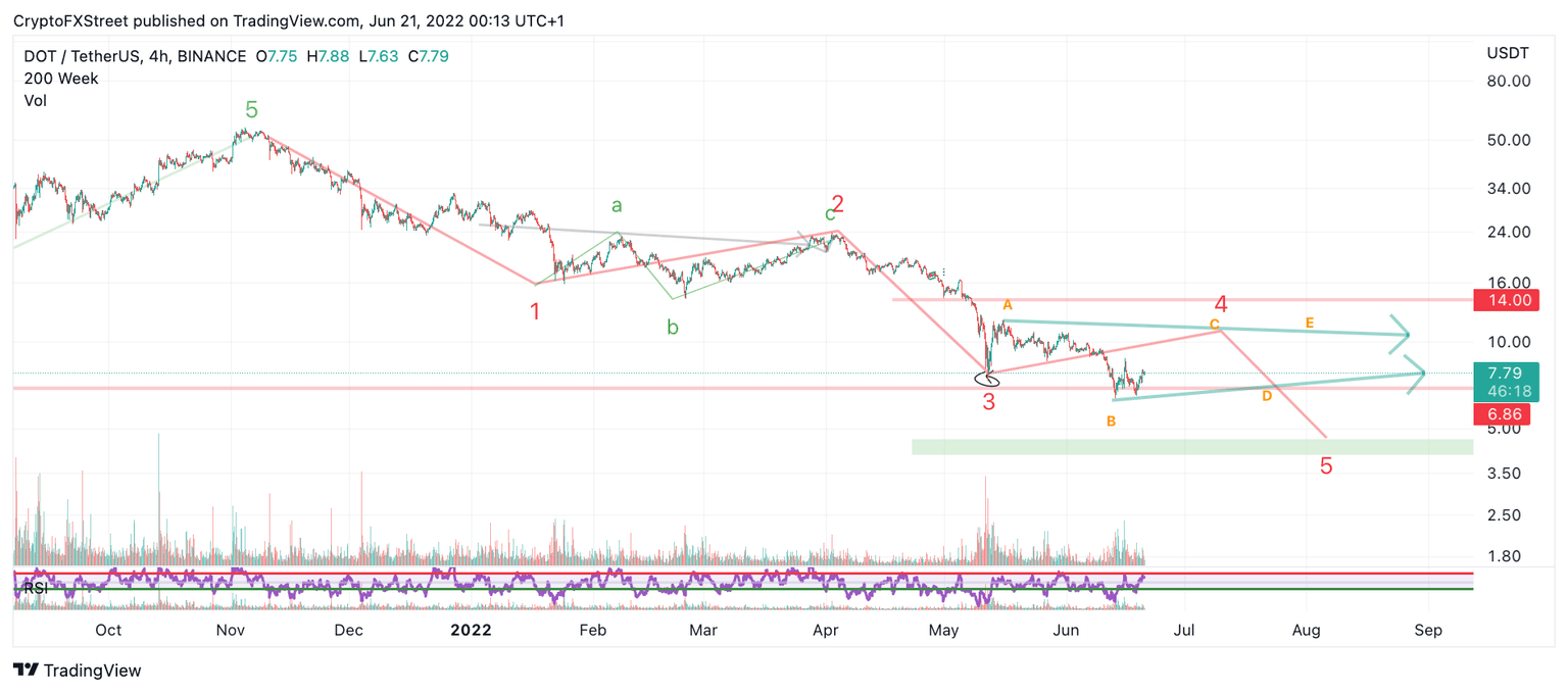 Polkadot price is still in a significant downtrend unless $16.42 is touched. One more decline is possible to create the fifth wave down. The volume profile shows bullish re-entrance into the market while bitcoin has been signaling multiple market bottom indicators. Invalidation of this downtrend idea is a breach above wave A at $11.47.