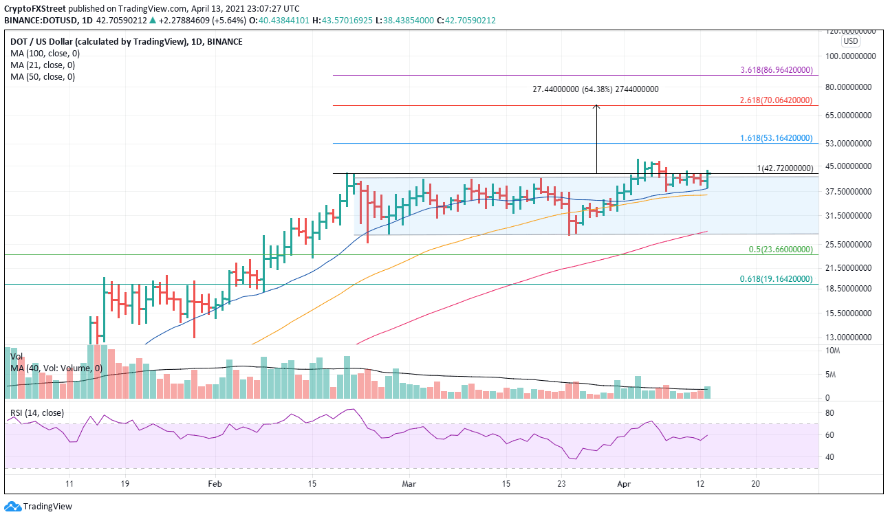Polkadot price failed on its first attempt to break out above the February high at $42.72 and is currently resetting just above the 21-day simple day moving average (SMA). The setback is mild and on low volume, keeping the emphasis on the bullish outlook moving forward.