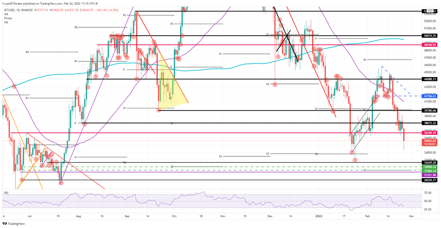 Cryptocurrencies are waking up to a shocker this morning as the whole Eastern border of Ukraine is under siege of missile attacks by Russia and Belarus. This afternoon, NATO and the EU are scrambling for emergency meetings to further retaliate with sanctions cutting off Russia entirely from the financial system. In the meantime, investors are hoarding cash and pulling out their money into safe havens, but in the process, offering some lovely entry levels for the longer term.