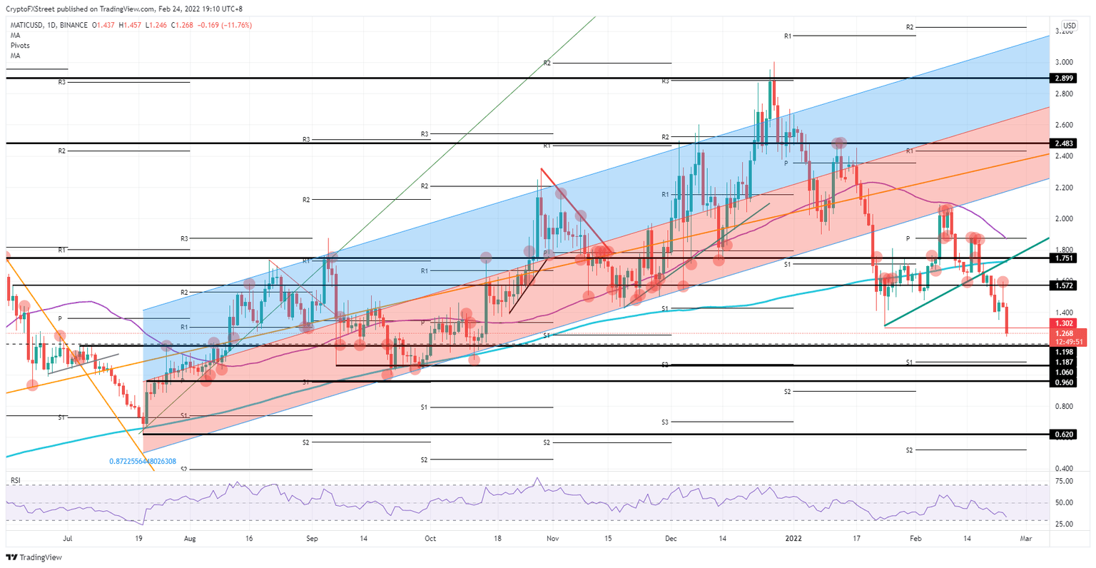 Polygon (MATIC)) is on the cusp of slipping below $1.00 as price action comes under selling pressure as military action in Ukraine rattles global markets. Russian troops are bombing several significant cities and reports are coming in of military convoys crossing mainland Ukraine with Russian troops. Global markets triggered a massive sell-off across the board, with safe havens heavily bid and risk assets being kicked out of portfolios.