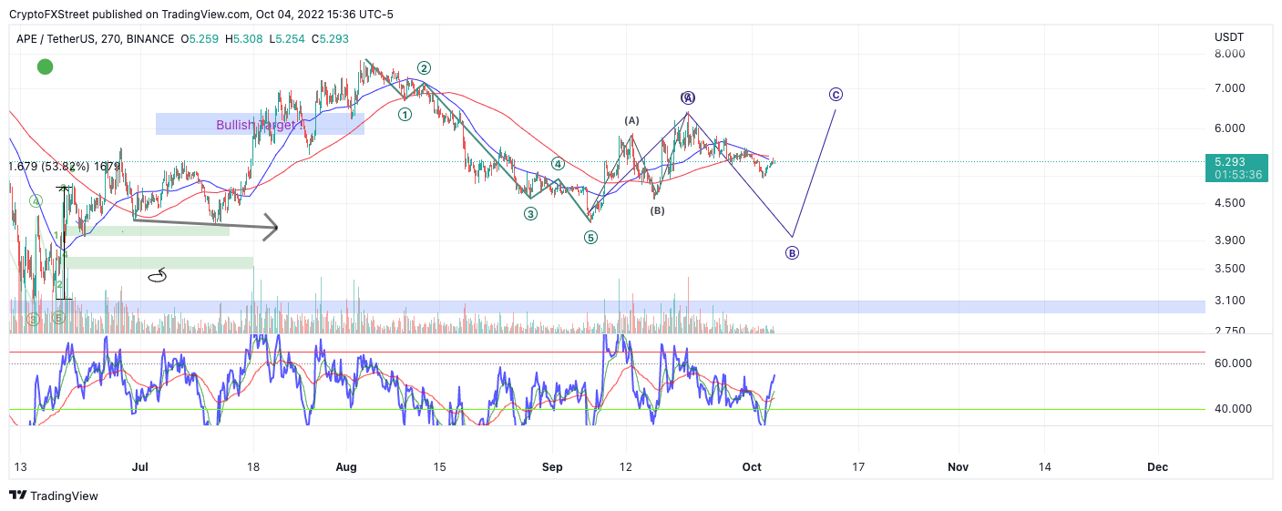 ApeCoin price shows resistance under two crossing moving averages. APE price shows a tapering look on the Volume Profile pattern but breached extremely oversold territories on the Relative Strength Index. Invalidation of the bear trend remains at $6.15.
