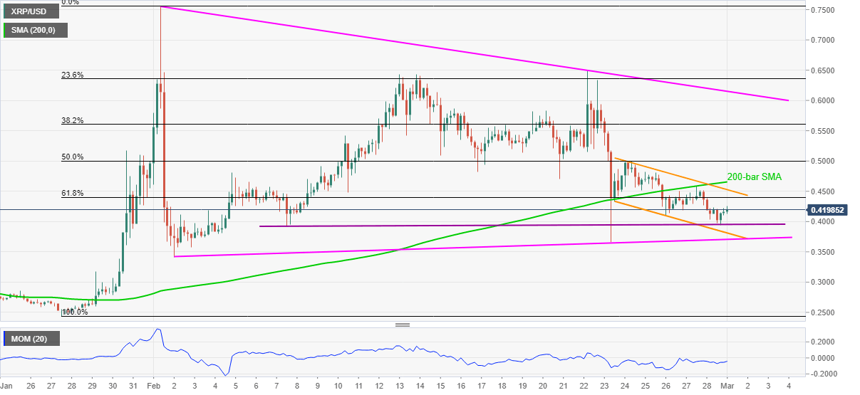 XRP/USD eases from an intraday high of $0.4258 to currently around 0.4216 during early Monday. Even so, the altcoin keeps the bounce off short-term horizontal support while flashing 1.5% gains on a day. One-month-long ascending trend line adds to the support.