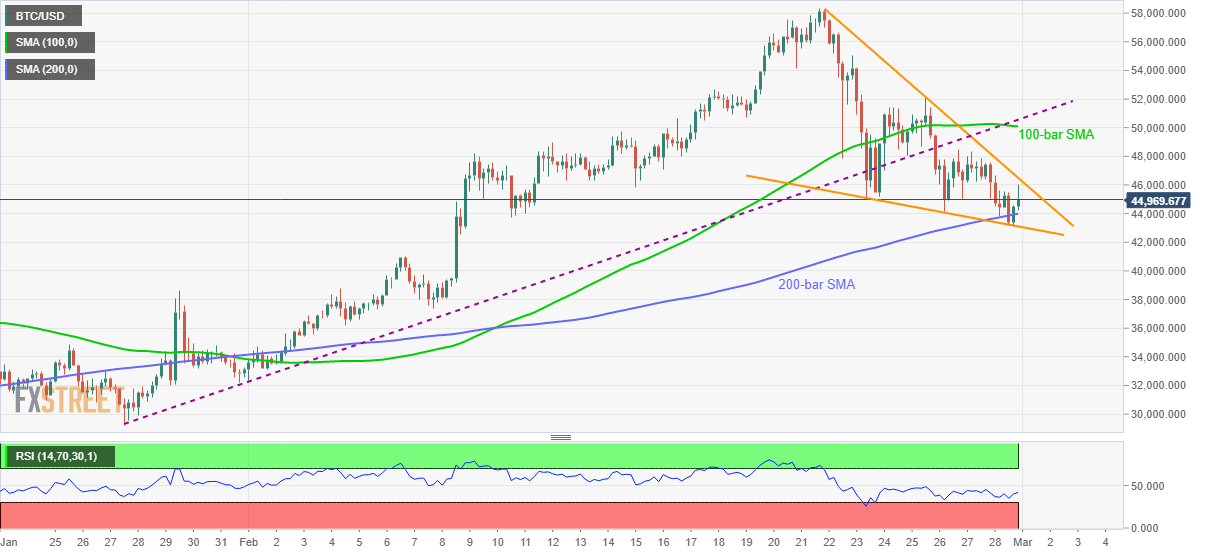BTC/USD drops from the intraday high near $46,000 to currently around $45,100 during early Monday. Even so, the crypto major keeps bounce off 200-bar SMA, marked during the weekend, while also staying inside a bullish chart pattern on the four-hour play. Bears can eye for early February tops during further weakness.