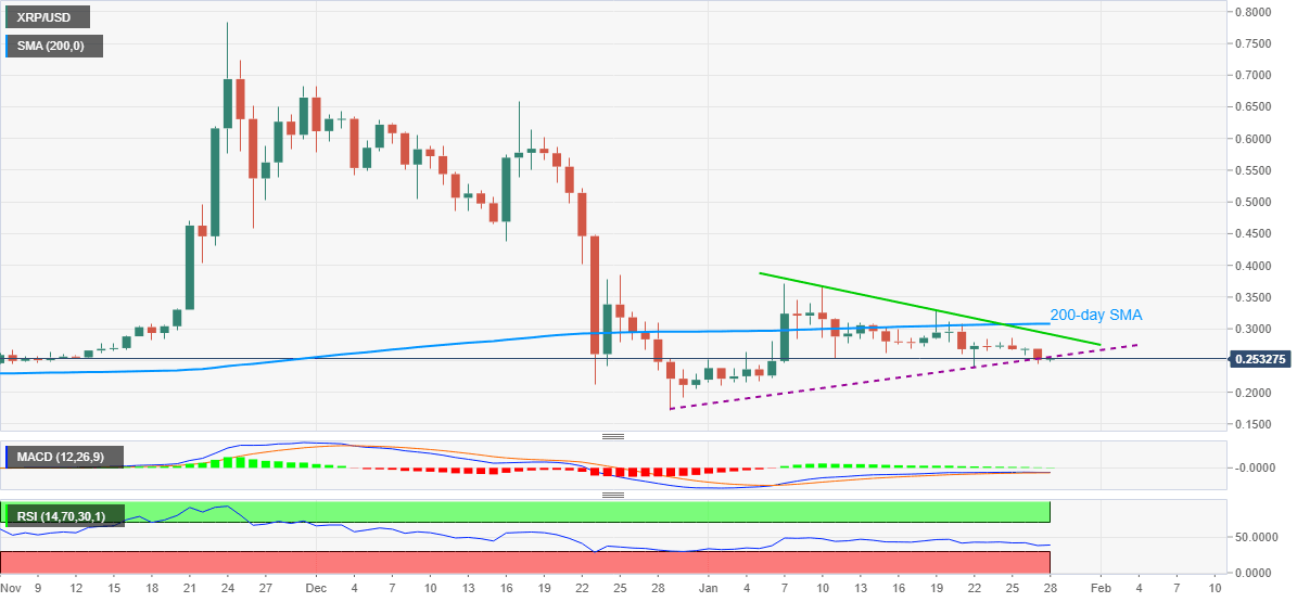 XRP/USD nurses the previous day’s losses while picking up bids near 0.2520 during early Thursday. Even so, the ripple pair remains vulnerable for further downside as it keeps the break of a one-month-old support line. Bulls will have to cross 200-day SMA to retake controls.