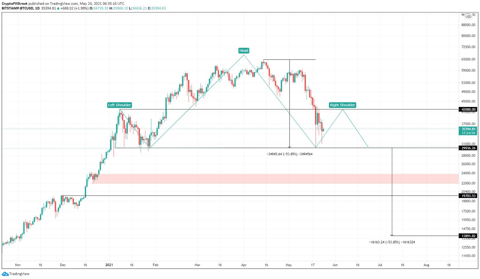 Bitcoin price looks prime to surge by roughly 40% after bouncing off the $29,936 support level.The daily chart shows that BTC is forming a potential reversal pattern known as head-and-shoulders. The bearish setup contains a central peak referred to as the head, while the other two comparable upswings are known as shoulders. Meanwhile, the horizontal support at $29,936 is known as the neckline.