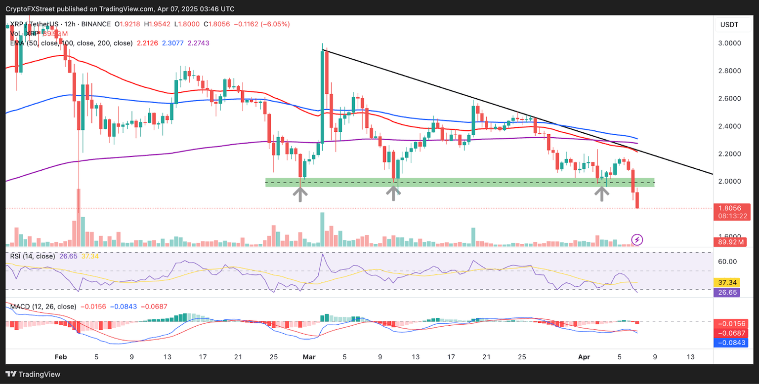 Ripple (XRP) is extending losses below the previous week’s critical level at $2.00, as United States (US) President Donald Trump doubled down on tariffs, stressing that America must solve the trade deficit before making a deal. The international money transfer token is trading at $1.82 during the late Asian session on Monday, after correcting 10.7% in the last 24 hours and bringing the cumulative seven-day decline to 10%.