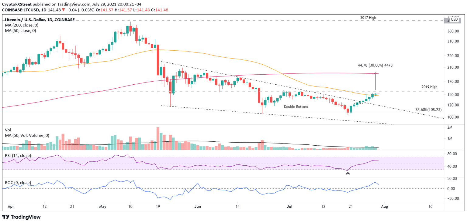 Litecoin price confirms breakout from the governing falling wedge pattern on July 25, marking a turning point for the altcoin and introducing new technical challenges. If the obstacles are overcome, the double bottom pattern projects a 30% gain for LTC in the weeks ahead. 2019 high of $146.00 resurfaces, raising doubts of the rally sustainability, despite impulsive rebound.